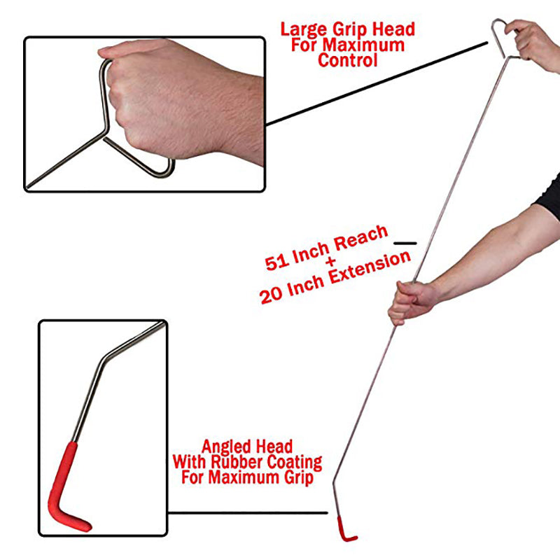 High quality solid steel construction, not easy to bend. It consists of 4 sections - 16.35" (~41.4cm) handle bar, 16.35" (~41.4cm) hook rod and 2 16.5" (~41.9cm) extension rods, up to 65" (~168cm) when assembled ). 3 sizes can be assembled according to different needs. Non-slip soft rubber handle protection and groove design, easy to assemble and disassemble, lengthen the hook head rubber position, no need to worry about damaging the car paint.